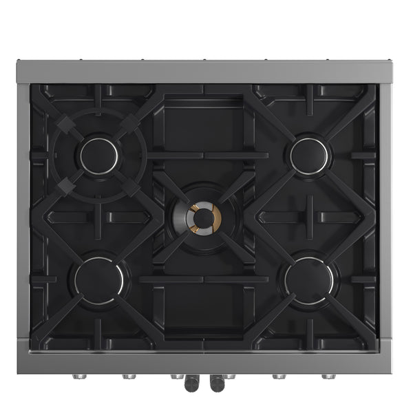 The Forno Massimo 30 Inch French Door Gas Range brings professional styling and Performance into your home kitchen with its durable stainless-steel design. Unique French doors offer generous clearance of up to 12 Inch or more, ensuring effortless access to your oven. The range top has 5 sealed burners, totaling 68,000 BTU, of which one is a 20,000 BTU dual-ring brass burner that can simmer at 1,000 BTU. The continuous cast iron grates ensure stability and mobility over the enamel surface that will contain any spills. The 4.32 cu. ft. gas oven with a total output of 30,000 BTU is encased in a speckled blue enamel interior fitted with a convection fan, ensures to achieve fast and consistent oven cooking along for easy viewing is a 3-layer glass oven door window. Included is an LP conversion kit, 2 telescopic oven racks, wok support, reversible griddle, air fryer kit and drip pan. Additionally, zinc coated illuminated metal knobs with bezel rings will maintain their beauty for years.