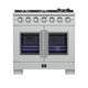 The Forno Massimo 36 Inch French Door Gas Range brings professional styling and performance into your home kitchen with its durable stainless-steel design. Unique french doors mean open doors allow up to 12 Inch or more space to access your oven. The range top has 6 sealed burners totaling 83,000 BTU, of which one is a 20,000 BTU dual-ring brass burner that can simmer at 1,000 BTU. The continuous cast iron grates ensure stability and mobility over the enamel surface that will contain any spills. The 5.36 cu. ft. convection oven with a total output of 30,000 BTU is encased in a speckled blue enamel interior fitted with a convection fan, ensures to achieve fast and precise oven cooking along for easy viewing is a 3-layer glass oven door window. Included is an LP conversion kit, 2 telescopic oven racks, wok support, reversible griddle, air fry basket kit and drip pan. Additionally, zinc coated illuminated metal knobs with bezel rings will maintain their beauty for years.
