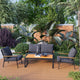 Sustainably-sourced Teak hardwood tabletop and sofa chair trim