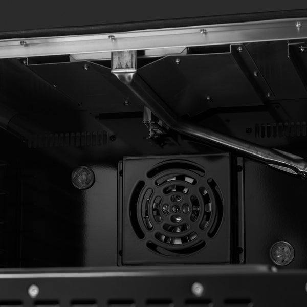 The Forno Galiano 48" Gas Range in black with antique brass accessories combines professional-grade performance with durability. The cooktop features 8 sealed burners with a total output of 107,000 BTU, including a 20,000 BTU dual-ring burner that can simmer at 1,000 BTU. Our cast iron grates ensure cookware stability and effortless movement between burners. The main convection oven offers 4.32 cu. ft. and delivers a total of 30,000 BTU for broiling and baking, while the secondary oven has a capacity of 2.26 cu. ft. with a 14,00 BTU for baking. Both ovens feature a sleek black enamel interior and a three-layer tempered glass door for superior heat retention and clear visibility. Additional features include 2 oven racks, an LP conversion kit, and durable zinc-coated knobs with bezel rings, built to maintain their beauty. Backed by Forno's 2-year warranty, this range offers peace of mind, lasting performance, and exceptional affordability.