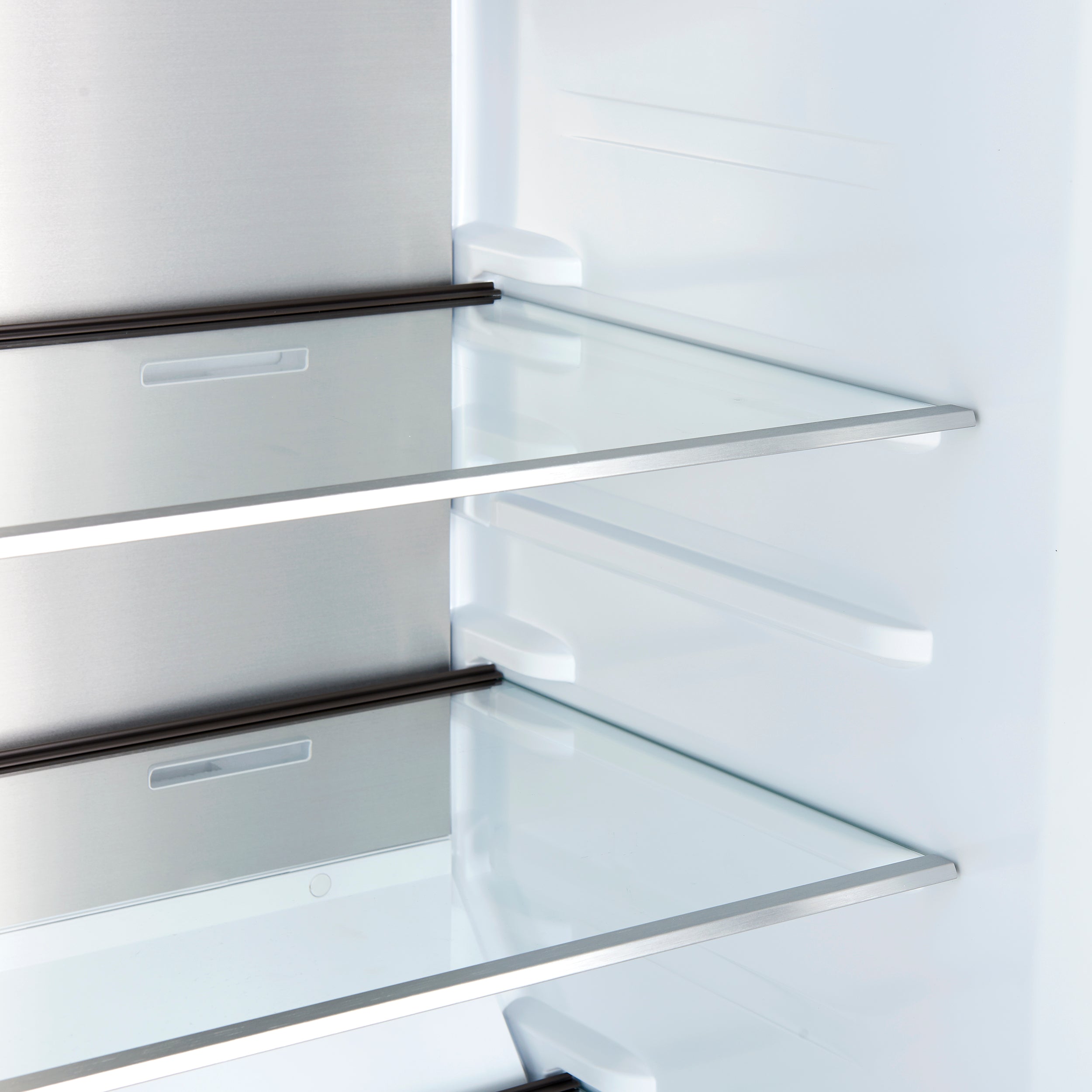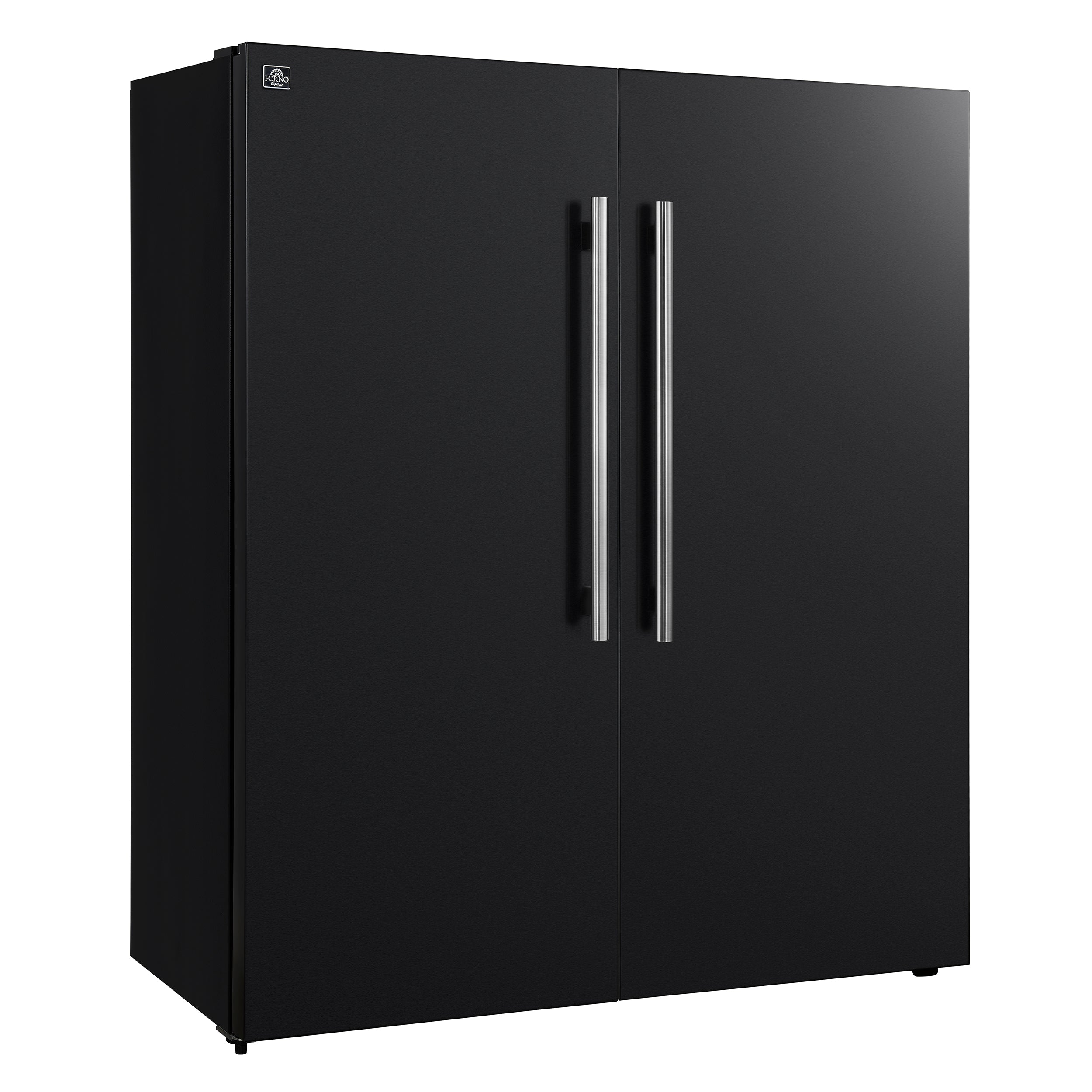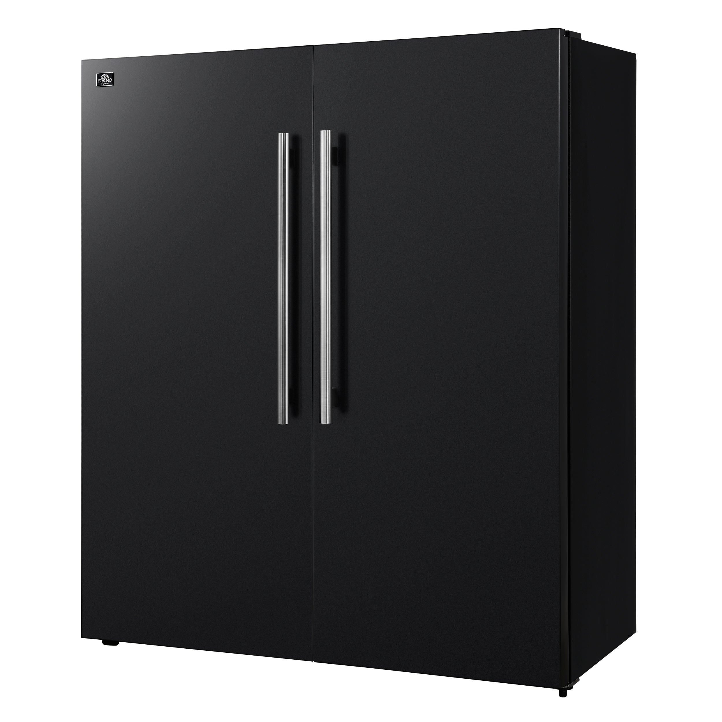 The Forno Maderno provides a premium 60 inch built-in refrigerator look by combining two 28 inch units with a trim kit for seamless side-by-side installation. This fridge freezer combo comes in a black finish with antique brass handles as part of our Espresso line, adding a boldness to any modern kitchen. With a total capacity of 27.2 cu.ft., it's ideal for large households or serious entertainers. Inside, you’ll find Convertible Cooling Zones that let you switch between refrigerator and freezer mode, Total No-Frost technology to prevent icy build-up, and a sleek digital control panel for easy adjustments. The Maderno includes six tempered glass shelves with silver trim, six storage drawers, and bright LED lighting to help keep everything organized and easy to find. VCM-coated doors and a durable metal back panel add strength and a fingerprint-resistant finish. Energy Star certification ensures this side-by-side built-in refrigerator is energy efficient.