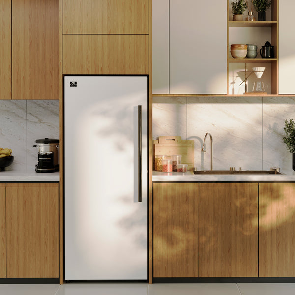The Forno Maderno 28-inch Convertible Refrigerator/Freezer combines style and performance with a 13.6 cu.ft. storage capacity. Featuring Total No-Frost Technology, it eliminates the need for manual defrosting, while the Metal Multi-Airflow system ensures consistent cooling throughout. Inside, 3 glass shelves and 3 drawers with silver trims offer organized storage, complemented by door bins for added functionality. The swing door design and touch control panel make everyday use simple and intuitive. Finished with durable VCM doors and a metal back panel, and backed by an Energy Star Certification, it delivers both elegance and long-term efficiency. Available in white and featuring antique brass handles, it’s part of our elegant Espresso line.
