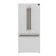 The Forno Espresso Milano 31" Bottom Freezer Refrigerator with Ice Maker offers 17.2 cu. ft. of efficient storage in a sleek, space-saving design. Featuring a crisp white finish and elegant antique brass handles, it adds a sophisticated touch to any kitchen. Two full-width freezer drawers provide easy organization for frozen foods, while digital touch controls ensure accurate temperature management. Super Cool and Super Freeze functions help lock in freshness faster. Energy Star Certified for efficiency, it also includes high-efficiency LED lighting to help reduce food spoilage. Adjustable shelves, door bins, and a full-width drawer make customizing storage simple and convenient.