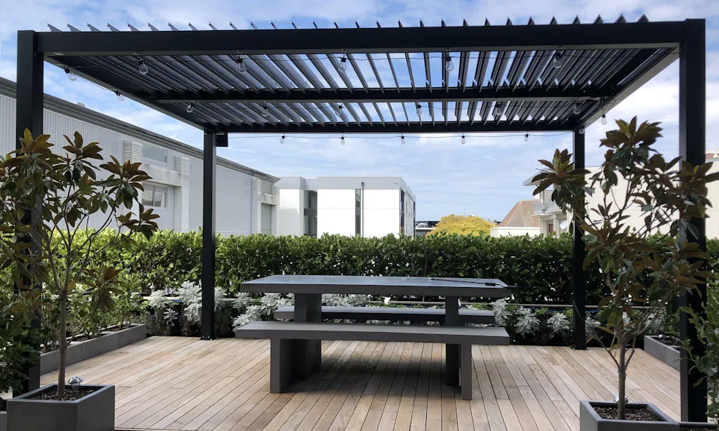 Our metal pergolas, all frame are made from aluminum, louvers are made from steel. Dissipates heat faster, lasts longer, and is more environment-friendly than other metals.